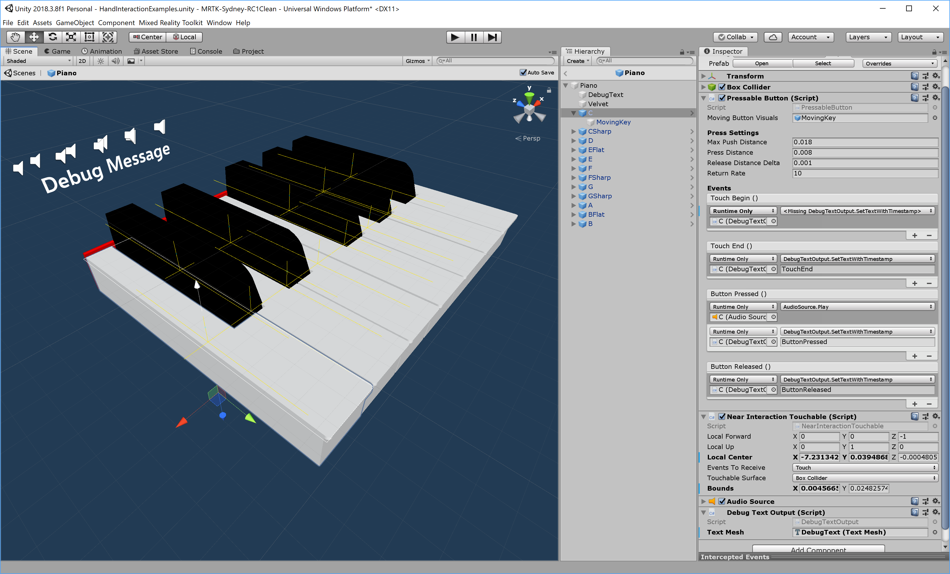 各ピアノのキーには、PressableButton と NearInteractionTouchable のスクリプトが割り当てられています。NearInteractionTouchable の Local Forward の方向が正しいことを確認することが重要です。エディターでは白い矢印で表されます。矢印がボタンの前面からその先を指していることを確認してください。