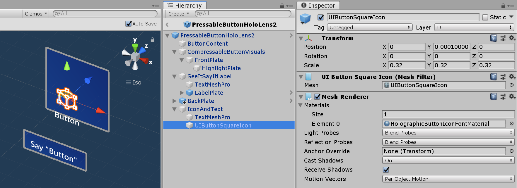 ボタンのテキストを変更するには、IconAndText 配下の TextMeshPro オブジェクトの Text コンポーネントを更新します。アイコンを変更するには、UIButtonSquareIcon オブジェクトにアサインされているマテリアルを置き換えます。デフォルトでは、HolographicButtonIconFontMaterial がアサインされています。