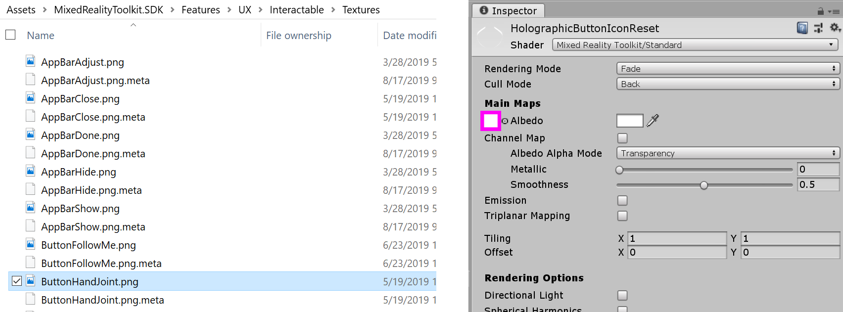 新しいアイコンのマテリアルを作成するには、既存のアイコン マテリアルの1つを複製します。アイコン マテリアルはMixedRealityToolkit.SDK/Features/UX/Interactable/Materials フォルダー内にあります。