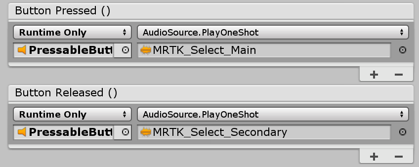 PressableButton.cs のスクリプトは TouchBegin()、TouchEnd()、ButtonPressed()、ButtonReleased() などのイベントを公開するため、音声フィードバックを簡単に割り当てることができます。Unity の Audio Source をキューブ オブジェクトに追加し、AudioSource.PlayOneShot() を選択してオーディオ クリップを割り当てます。/SDK/StandardAssets/Audio/ フォルダーの下の MRTK_Select_Main および MRTK_Select_Secondary オーディオ クリップを使用できます。