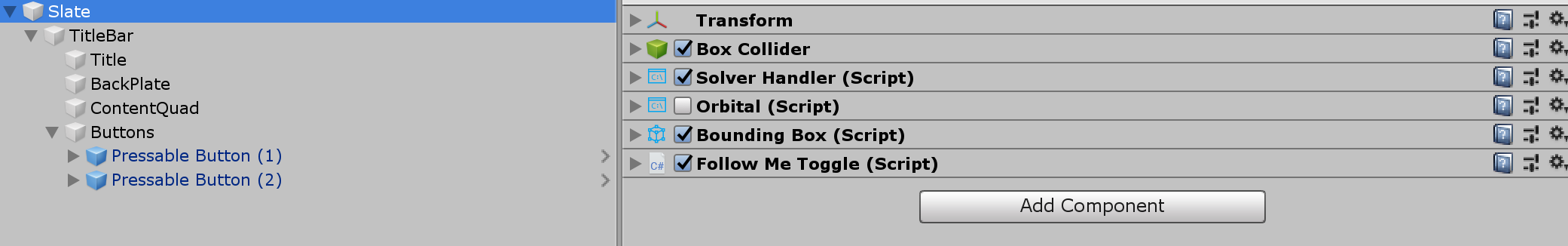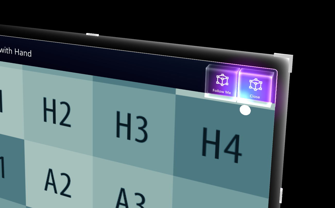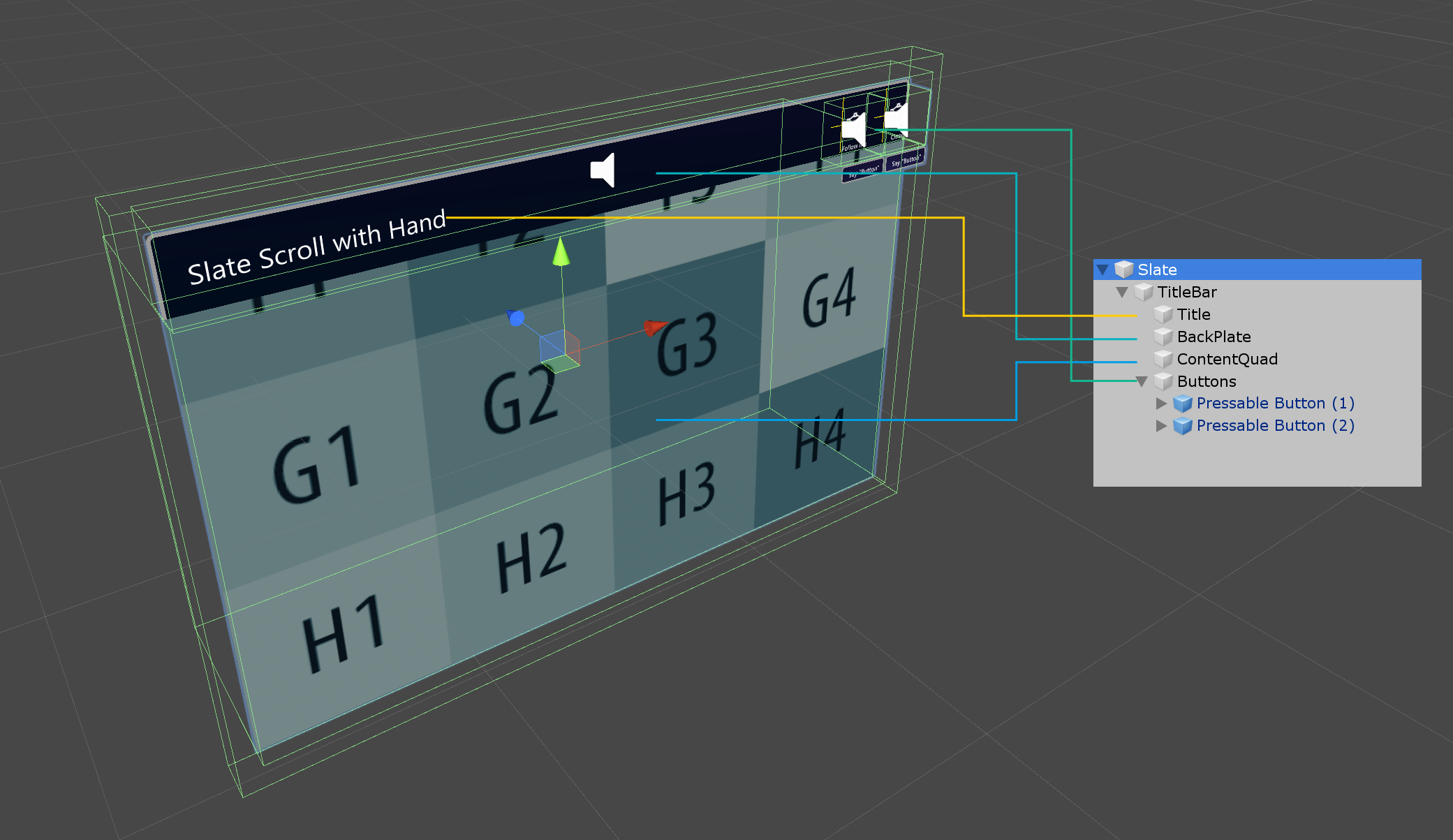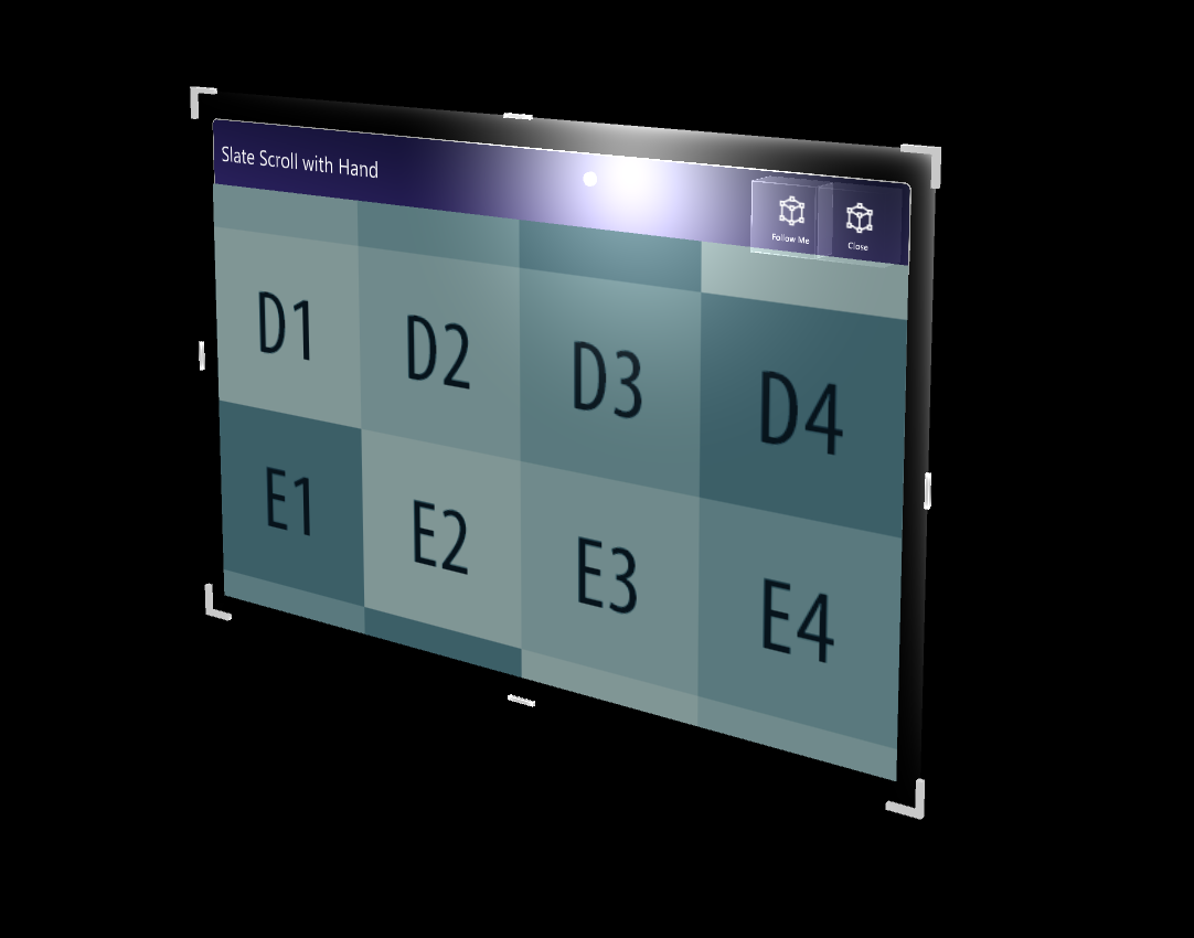 スレート プレハブは、2D コンテンツを表示するための薄いウィンドウ スタイルのコントロールを提供しています (例えば、プレーンテキストやメディアを含む記事)。これは、掴める (grabbable) タイトル バーだけでなく、Follow Me と Close 機能を提供しています。コンテンツ ウィンドウは、多関節ハンドの入力を介してスクロールすることができます。